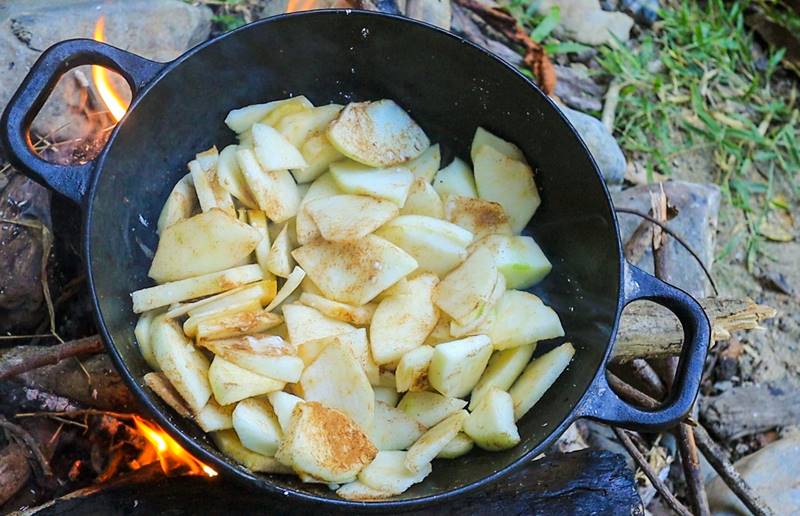 7. Mix sugar with cinnamon and apples. Sprinkle topping and cover the Dutch oven. Set it on charcoals.